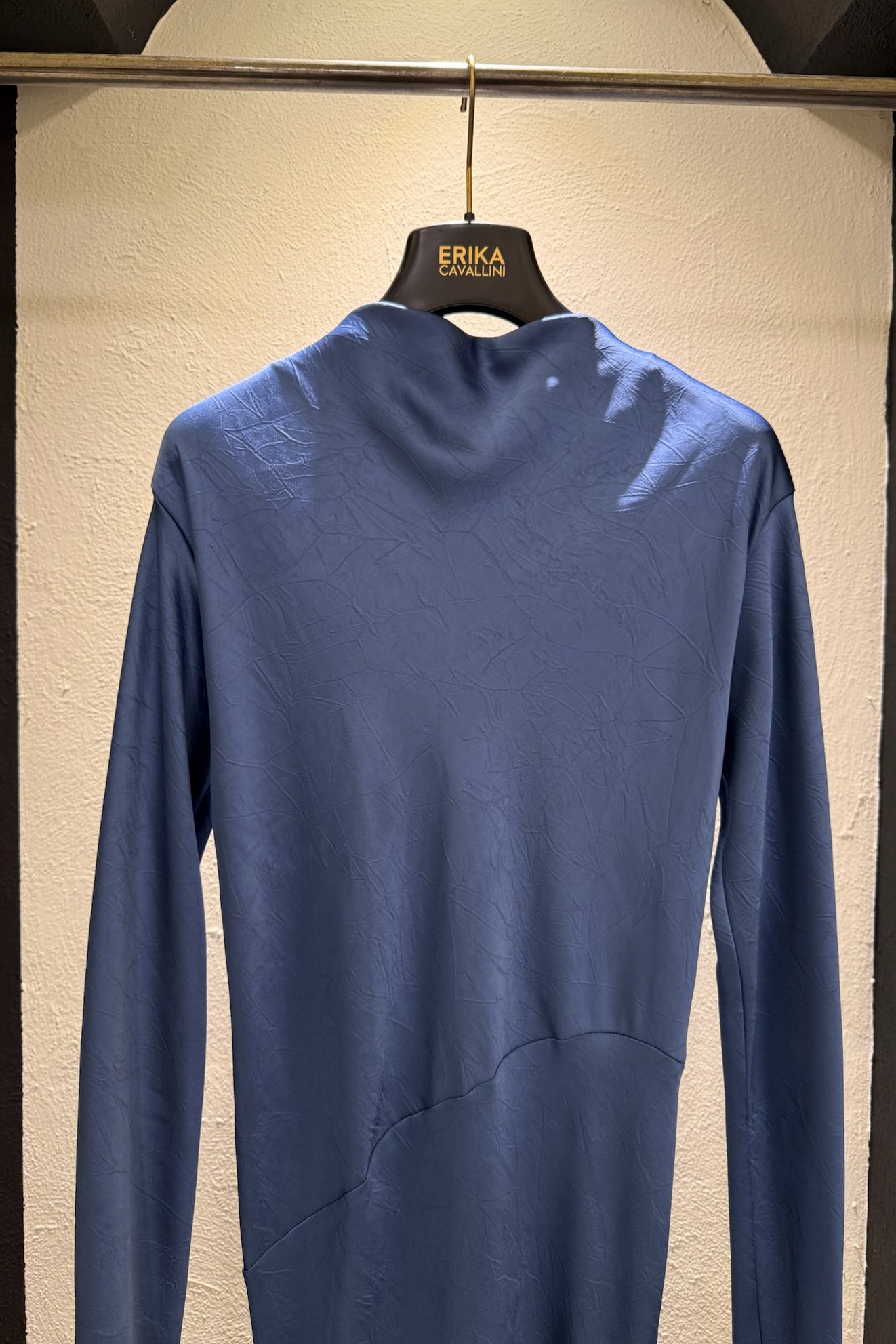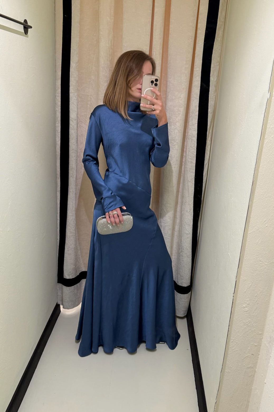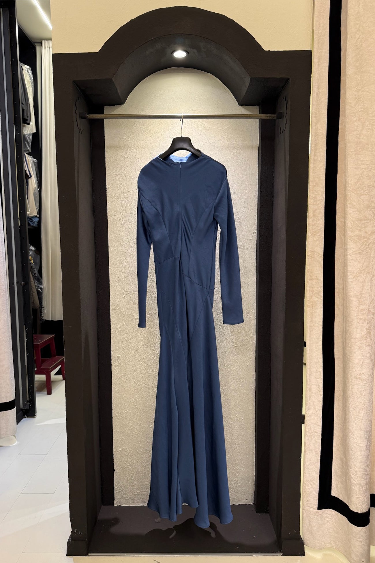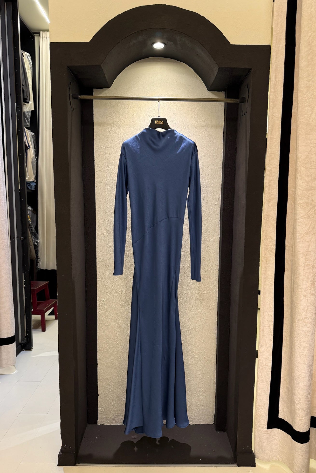Abito lungo in satin frisse', modello scivolato e svasato al fondo con tagli motivo sul davanti e dietro, scollo a cratere e maniche svasate al fondo. Apertura zip sul centro dietro.B
