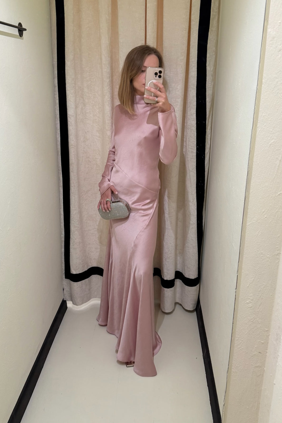 Abito lungo in satin frisse', modello scivolato e svasato al fondo con tagli motivo sul davanti e dietro, scollo a cratere e maniche svasate al fondo. Apertura zip sul centro dietro.B
