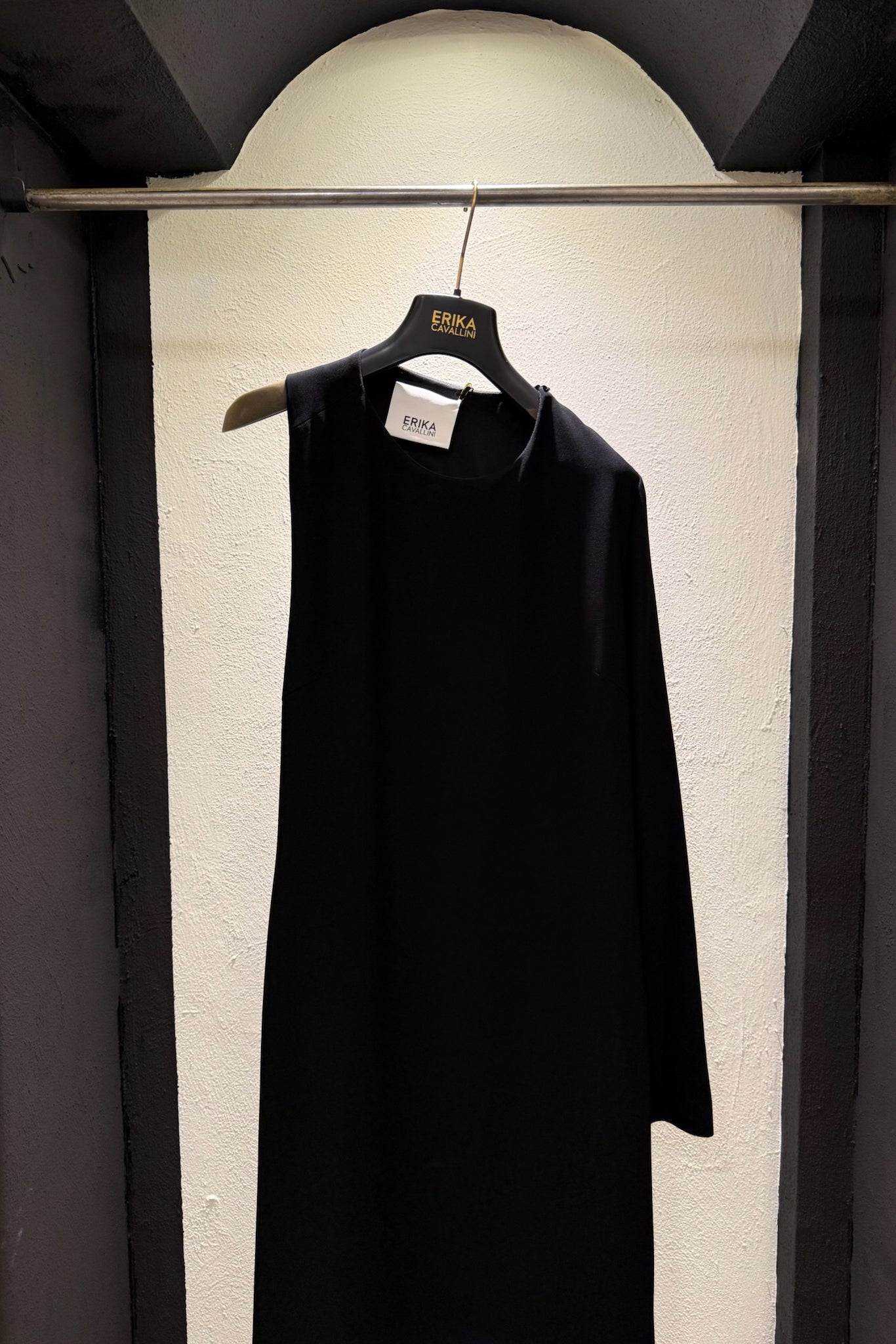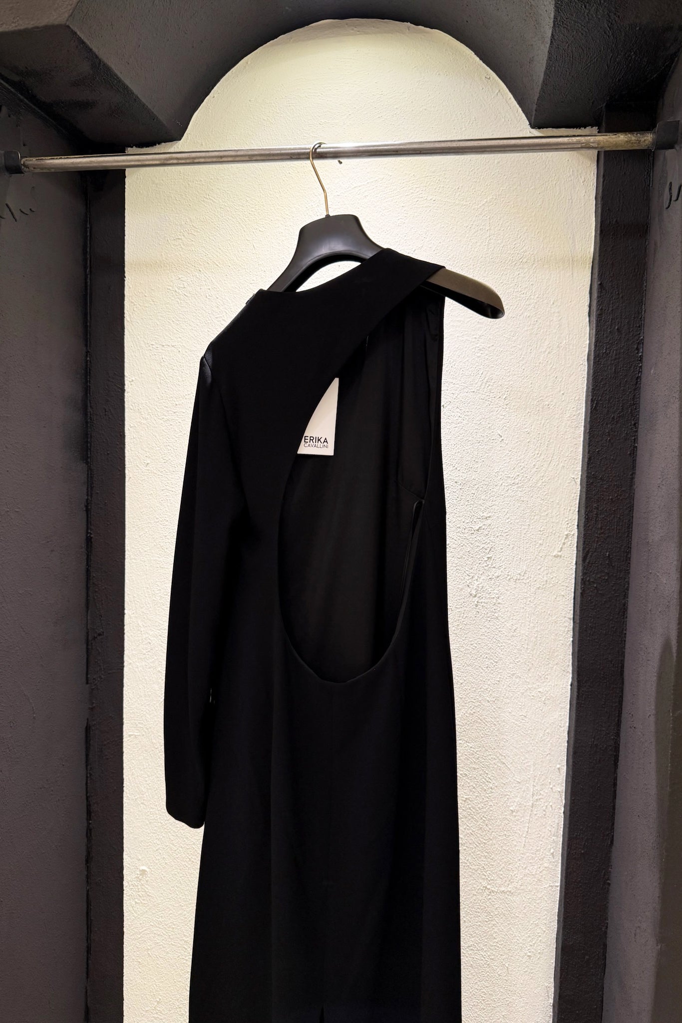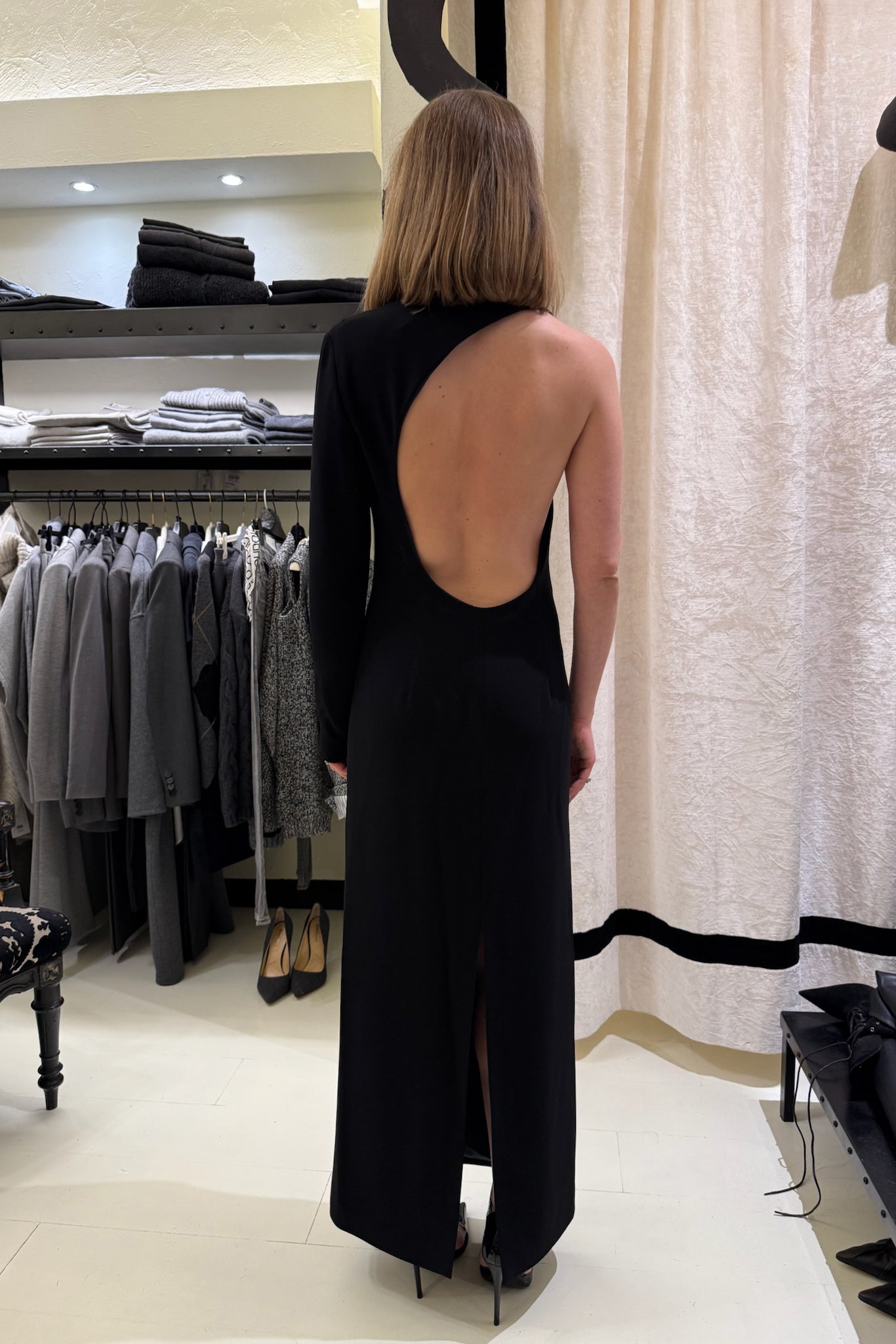 Abito lungo in crepe cady, modello girocollo con maniche asimmetriche e importante cut-out sulla schiena.