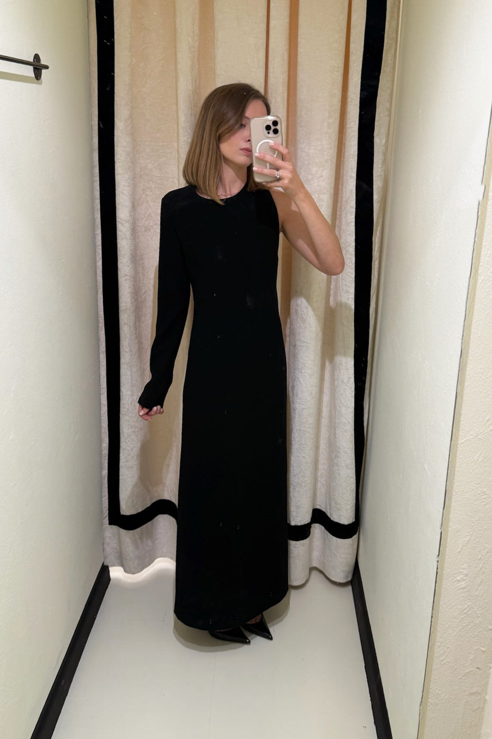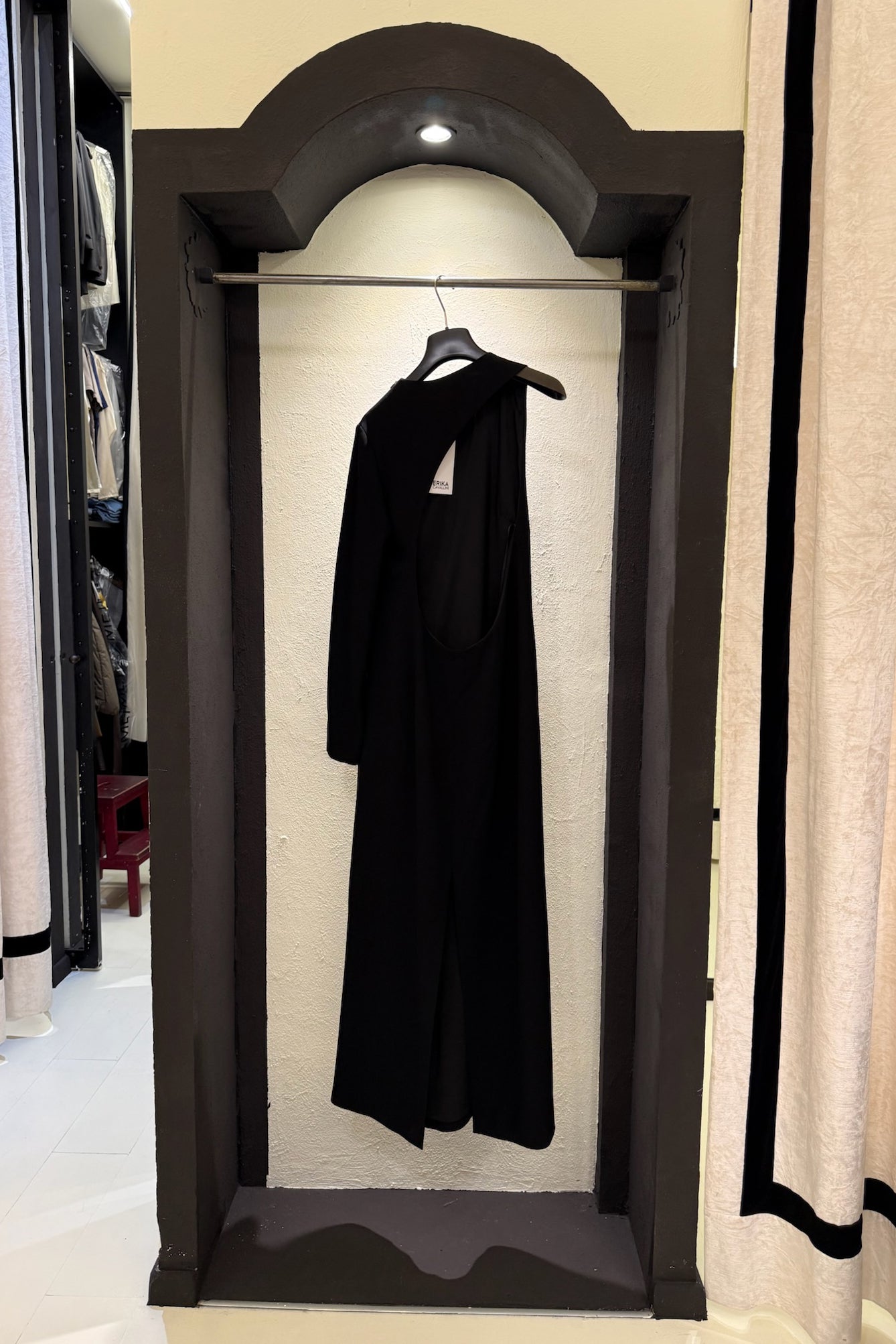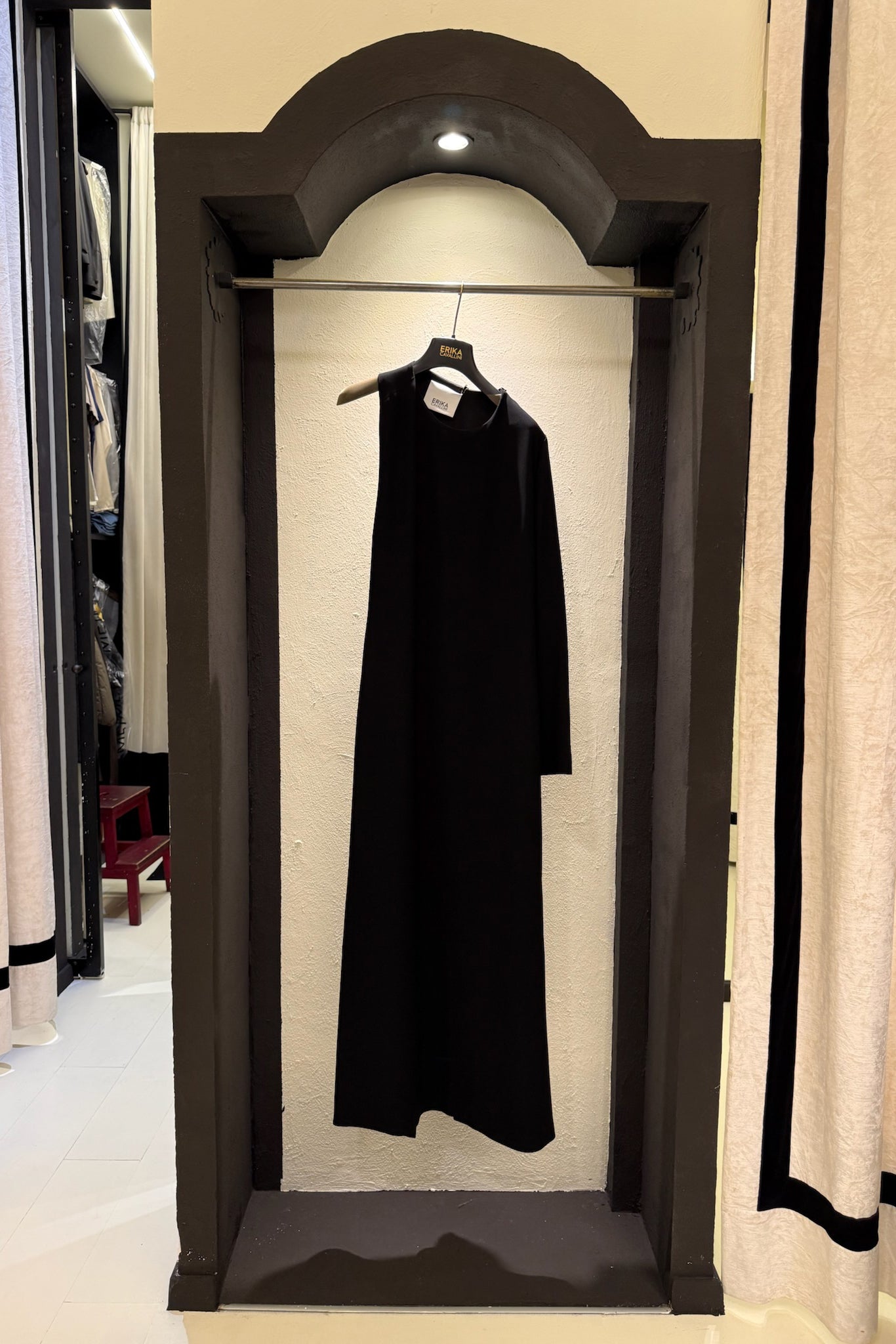 Abito lungo in crepe cady, modello girocollo con maniche asimmetriche e importante cut-out sulla schiena.