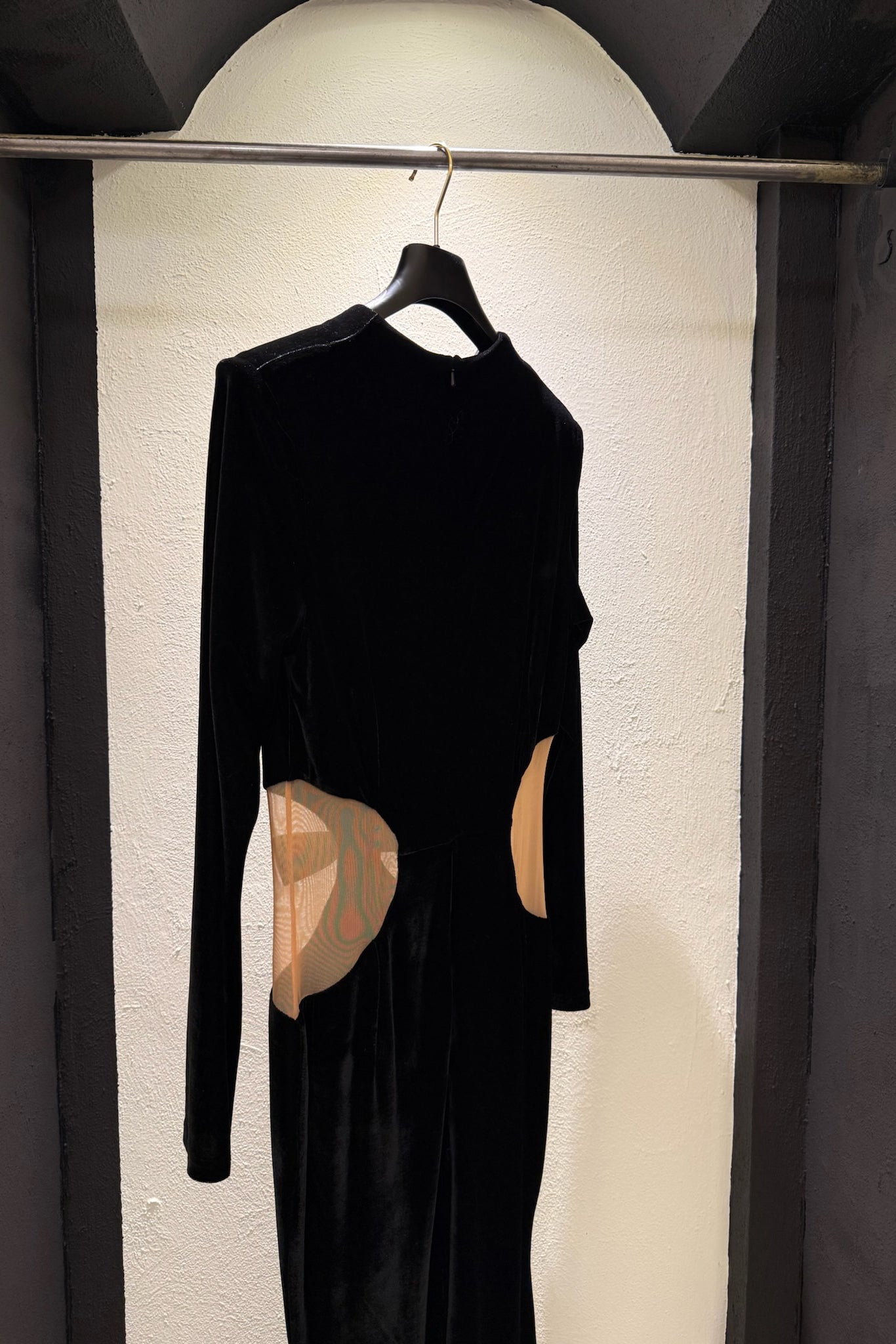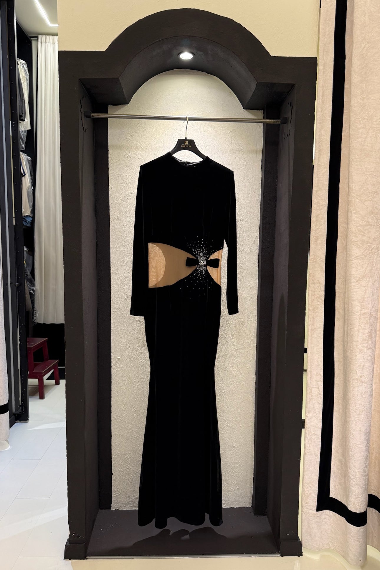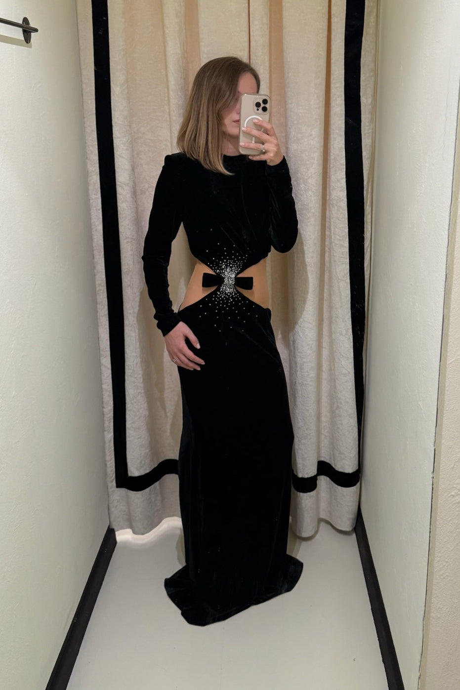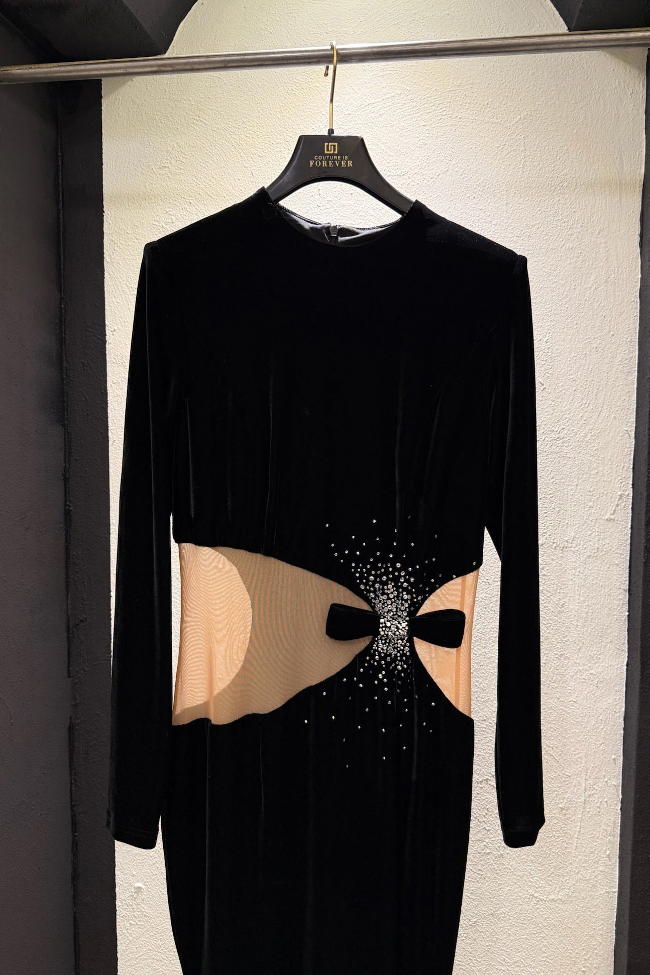 Abito lungo in velluto con trasparenza, strass e fiocco sul davanti. Chiusura zip sul retro.